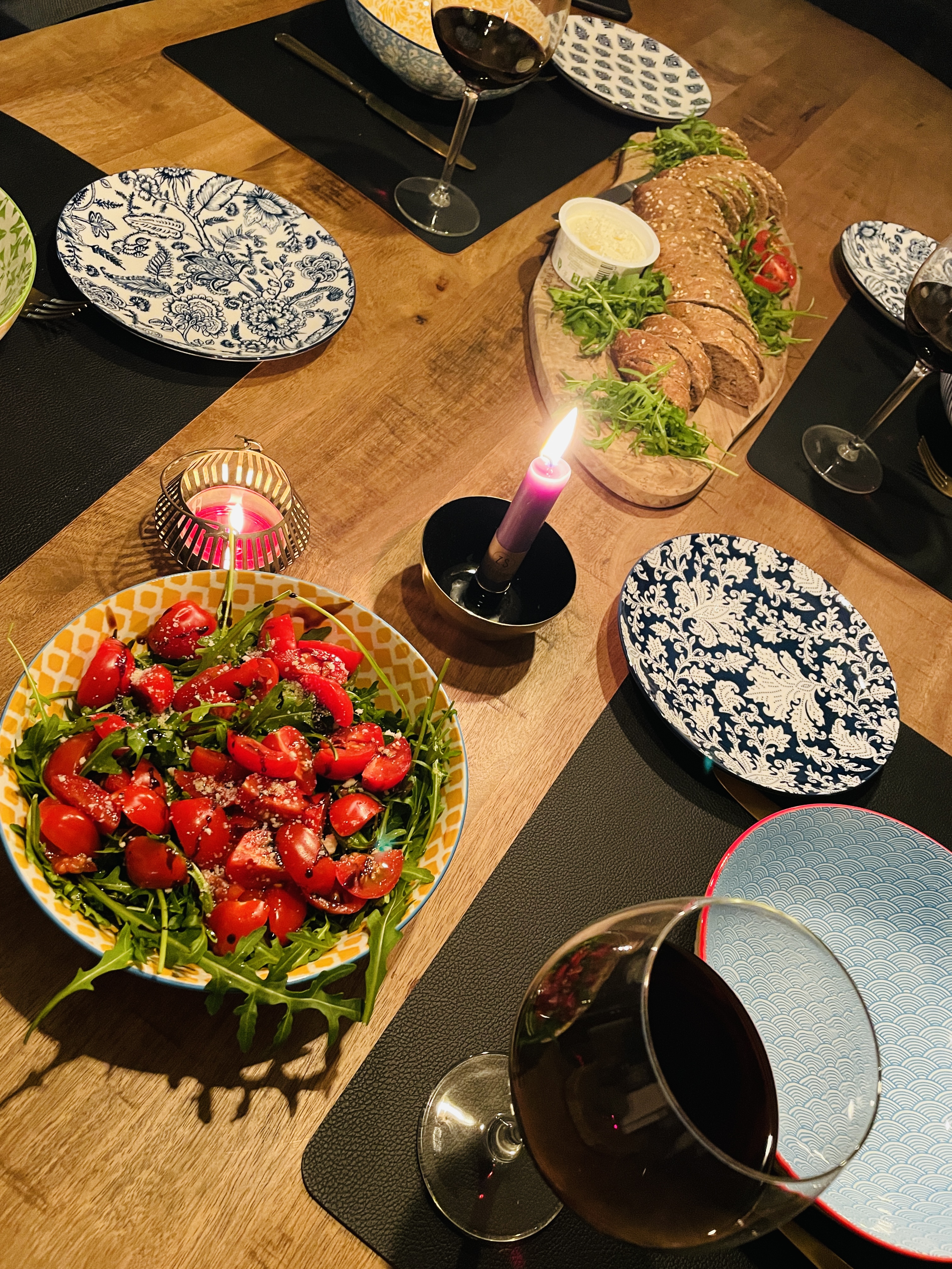 Regina en Jos zouden ’s avonds naar Utrecht komen met eten. Maar deze lieverds waren al naar ons huis gegaan. En toen wij thuiskwamen hing daar een prachtig spanddoek van de buren en rook onze keuken naar heerljk draadjesvlees. De tafel was gezellig gedekt en een heerlijk rood wijntje mocht niet ontbreken. Wat een feest…dit keer tranen van blijdschap.